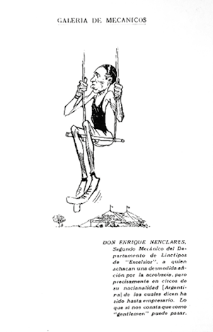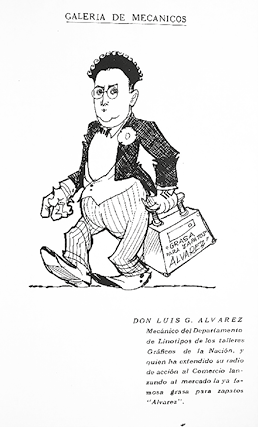 Volviendo a las viñetas de la ULRM, en varias de ellas el dibujante apostó por representar las contradicciones de estos sujetos: el león que realmente no lo es, el loco que “de loco no tiene nada”, el trapecista circense que en realidad es todo un “gentleman”, el mecánico que se dedica a la venta de grasa para los zapatos. Más aún, la mayoría de los sujetos aparecen rindiéndose frente al excesivo cuidado de su aspecto. Uno de los textos incluidos en el folleto conmemorativo llevó esta apelación a las apariencias hacia la crítica directa en contra de las prácticas de los agremiados. En palabras irónicas Silvino Mota se refería al “[…] distinguido linotipista, emperifollado dibujante, sapientísimo corrector de pruebas, cultos reportero y escritor, hasta el no menos conspicuo cajista de imprenta”. 22 Esta situación puede ser vinculada a dos procesos paralelos, que podían distinguir a este grupo de trabajadores. Por un lado, tenemos el distanciamiento que establecían entre sus dinámicas laborales y los otros espacios donde se encontraban. De hecho, un elemento que también debe ser destacado es que solo uno de los diez personajes dibujados en el folleto conmemorativo presenta su vestimenta de trabajo. Los demás aparecen como tenistas, trapecistas, vendedores puerta a puerta, o cualquier otra alternativa, sin representar aquel momento que precisamente los relacionaba, su espacio laboral. Sin embargo, es necesario tener en cuenta, como se ha planteado desde la historia social, que los procesos de articulación no pasaron solamente por el taller o la imprenta, sino que otros lugares también fueron centrales en su construcción como clase. En este caso, las mismas reuniones sindicales fuera del ámbito laboral probablemente contribuyeron con mayor énfasis a las caracterizaciones que están detrás de cada una de las viñetas, así como a sus procesos de aprendizaje y ejercicio políticos.