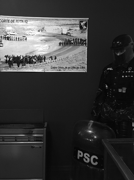 Esta imagen llama la atención porque, a pesar de expresar un trabajo bastante recurrente de la fuerza policial, relata un episodio de inminente violencia o mínimo de amedrentamiento ¿Qué licencia o autoriza a la policía santacruceña para develar esta acción? Por lo pronto, es una imagen excepcional en los museos policiales patagónicos. Tanto la muerte de Sayago (y su retrato entre los caídos) como la trayectoria policial de lucha por derechos laborales (tanto las de los años 1990s como las del 2010 en adelante) aparecen en las paredes de este museo, en cierta forma habilitando la presentación de esta gigantografía. La foto en sí muestra una imagen de enfrentamiento entre trabajadores (petroleros y policías) que aparecen equiparados en cantidad. En este sentido, revierte la habitual denuncia contra las fuerzas por el abuso en el uso de la violencia y recupera un tópico —aunque desde la perspectiva policial— silenciado en los museos policiales. En definitiva, tanto la muerte de un camarada como las expresiones de reclamos laborales confluyen y en cierta forma habilitan la exposición de esta gigantografía en donde se expone de forma singular (pero justificada) la violencia policial.