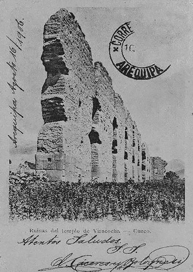 Muro incaico en Rajchi (Templo de Wiracocha). Postal ilustrada remitida desde Arequipa en agosto de 1906. Editada por Max T. Vargas (atribuido).