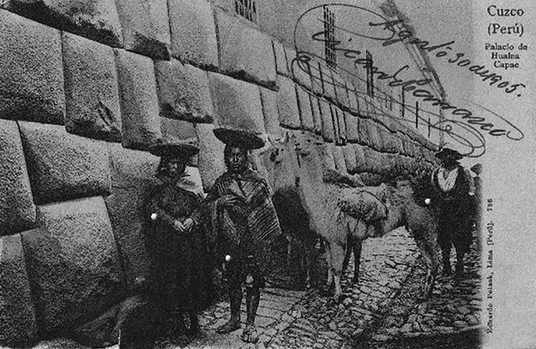 “Palacio de Huaina Capac–Cuzco (Perú)”. Postal ilustrada remitida desde Lima en agosto de 1905. Editada por E. Polack, a partir de una fotografía del Álbum República Peruana 1900.