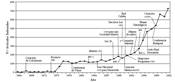 Figura 1: Artículos indexados internacionales y política de Ciencia y Tecnología, 1966-2002.
