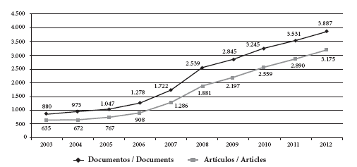 Figura 2: Producción bibliográfica de autores vinculados a instituciones colombianas en revistas indexadas en Web of Science, 2003-2012.