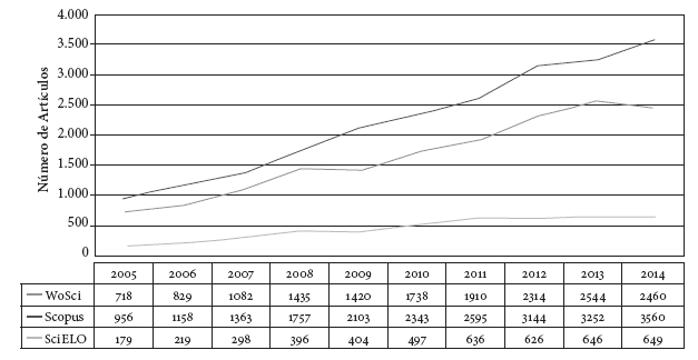 Figura 3: Producción bibliográfica de autores vinculados a instituciones colombianas en revistas indexadas en Web of Science, 2005-2014.*