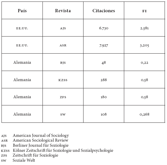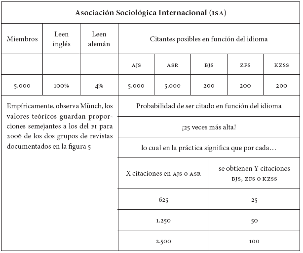 Una parte del argumento de Münch -simplificado aquí al extremo pero que recomiendo conocer en detalle-,24 compara los factores de impacto de las cuatro principales revistas alemanas de sociología, con sus dos homólogas norteamericanas (figura 6), para luego desmontar las diferencias que expresa el indicador, en términos de variables demográficas, materiales, económicas y simbólicas (figura 3).