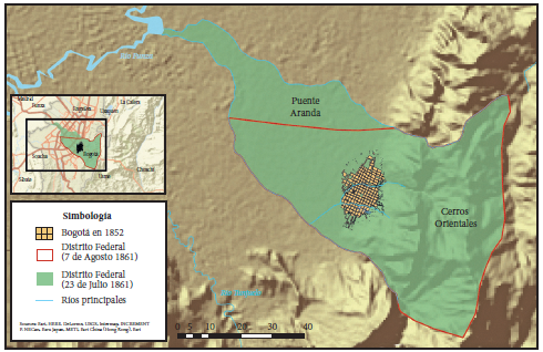 El estallido de la guerra civil aplazará la creación del distrito hasta 1861, decretada por Mosquera como presidente provisional de los Estados Unidos de Nueva Granda. Aunque dejaba su reglamentación en manos de una ley posterior, el Decreto de 23 de julio de ese año cesaba toda autoridad del estado de Cundinamarca sobre Bogotá, debiendo proceder su legislatura a la inmediata designación de una nueva capital estatal.31 El territorio del distrito estaba limitado al oriente por los cerros orientales, al norte por el río Arzobispo, al sur por el río Fucha y al occidente por el río Funza. Unos días más tarde, y a petición del gobernador del estado de Cundinamarca, se expidió el Decreto de 7 de agosto que modificó su límite occidental, como lo muestra la figura 1.