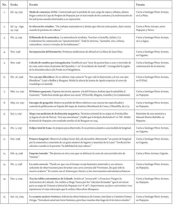 Tabla 1: Hitos en la concepción de Caldas del proyecto de cartografiar el Nuevo Reino, 1795-1799.