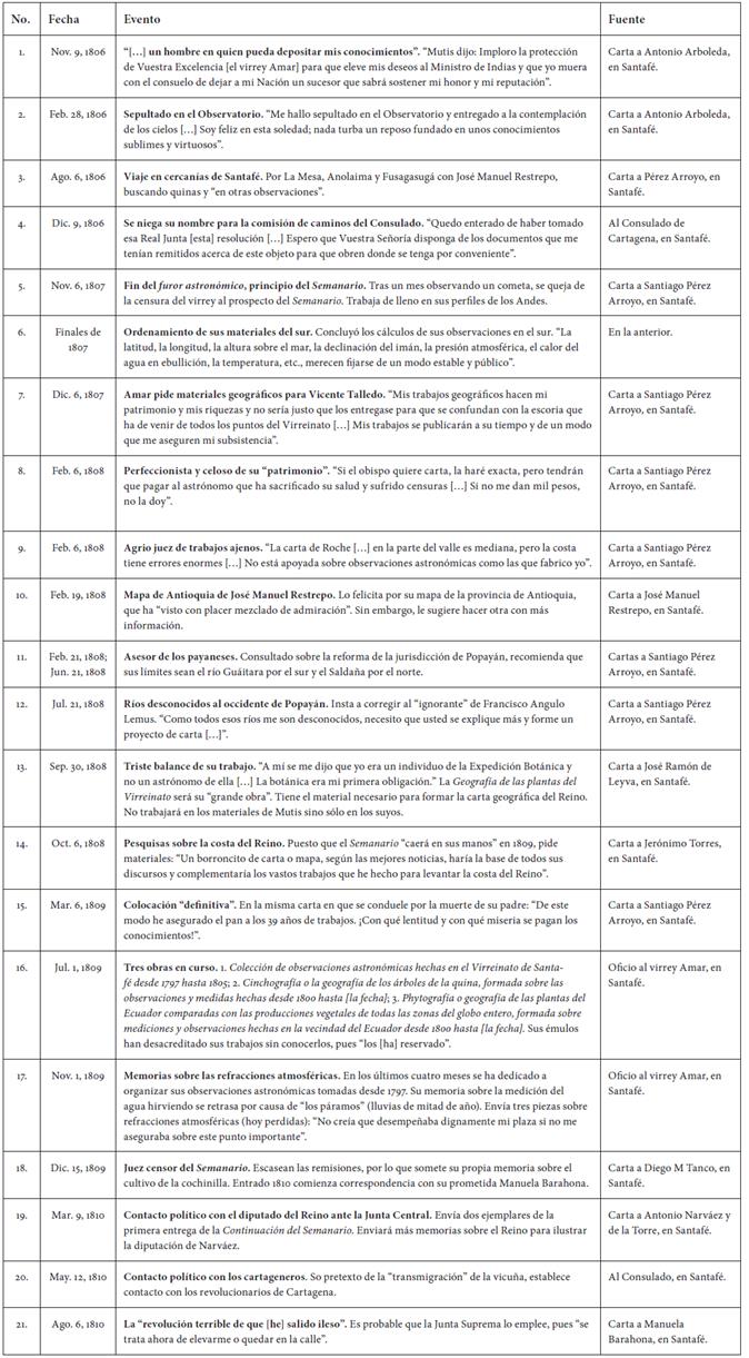 En los últimos cuatro meses he verificado largos trabajos sobre las refracciones astronómicas al nivel y latitud de este observatorio […]. Vuestra Excelencia hallará en mi Colección de observaciones astronómicas una "Memoria sobre las refracciones de Santafé". Todas las alturas meridianas del Sol, tan interesantes para las refracciones y tan necesarias para todo cuanto se ejecute en esta ciencia inmensa y sublime; las alturas de las estrellas, el último eclipse de Luna, las inmersiones y emersiones de los satélites de Júpiter, las ocultaciones de las estrellas por la Luna, el último solsticio felizmente observado, las variaciones del barómetro, termómetro e higrómetro tres veces cada día, cálculos dilatados, organización de observaciones y de manuscritos, son las ocupaciones que he tenido desde que merecí el encargo de este establecimiento.44