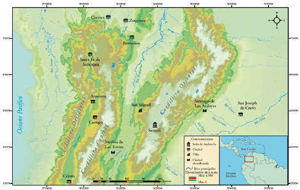 La fundación de ciudades y la creación de sus múltiples redes constituyeron un elemento fundamental en el proceso de dominación hispana en el continente americano, el cual se convirtió en el escenario propicio para construir ciudades que tuvieran un orden y cumplieran con ciertas funcionalidades desde su origen en lo urbanístico, lo político y lo económico. En situaciones que eran contrarias al sostenimiento, desarrollo y perpetuidad de los centros urbanos fue en donde prevaleció la idea de ciudad que albergaban sus habitantes y, sobre todo, la forma como la utilizaron en su beneficio. Los casos de ciudades como Antioquia, Remedios, Medina de las Torres y Santiago de las Atalayas, entre otras, demuestran la importancia del estudio de la ciudad colonial como una comunidad política, como civitas, ya que permiten ver la apropiación social de una idea de ciudad y su repercusión en el poblamiento neogranadino (ver figura 1).
