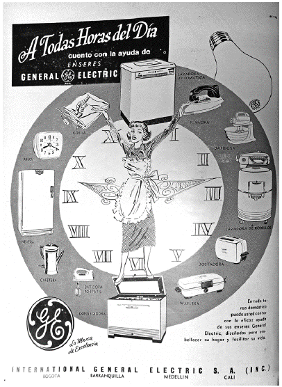 Por último, otros electrodomésticos, como la batidora portátil, la aspiradora, la brilladora de pisos y el lavaplatos, según la publicidad, lograban integrar varias tareas y con ello hacer óptimo y confortable el trabajo en el hogar. La batidora portátil General Electric mezclaba, amasaba, batía y extraía jugos; la aspiradora eléctrica de esta misma compañía barría, sacudía, aspiraba, limpiaba, lustraba, purificaba, fumigaba y cepillaba; la pulidora de piso de esta marca, lavaba, limpiaba, estregaba, lijaba, enceraba y brillaba; mientras que el lavaplatos Hotpoint lavaba, enjuagaba y secaba los platos higiénica y automáticamente.34