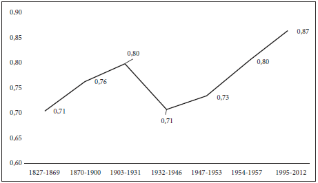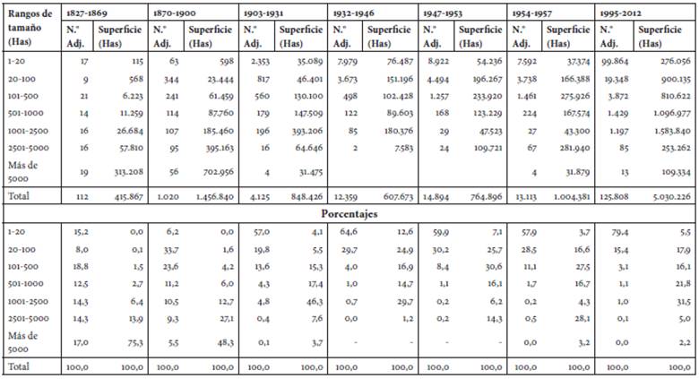Además, desde una perspectiva global y sin hacer diferenciaciones regionales, las asignaciones muestran en la práctica un Gini de adjudicación de baldíos bastante desigual en los distintos subperiodos entre 1827 y 2012: el coeficiente oscila entre 0,7 % y 0,8 % (figura 1).