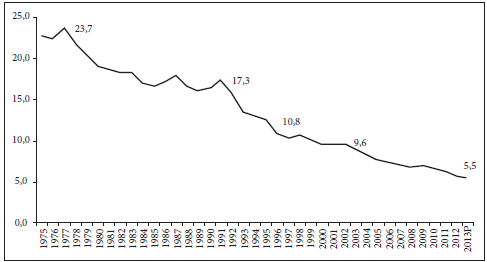 Figura 2: Participación de la agricultura en el Producto Interno Bruto, 1975-2013.