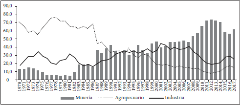 Figura 3: Participación porcentual del modelo agrominero en el valor de las exportaciones totales, 1970-2017.