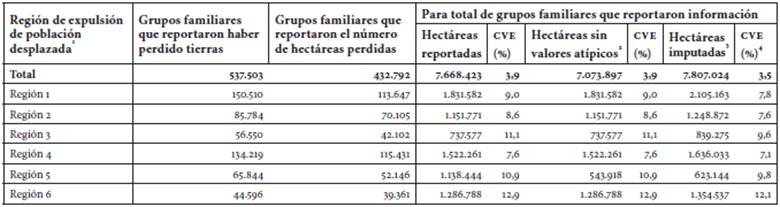 Uno de los aspectos que caracteriza la situación del conflicto en Colombia, el cual incluye entre sus variables principales los conflictos por la tierra, es que no existe, por parte de los actores en conflicto, el respeto a los derechos de propiedad jurídica establecidos en la Constitución y las leyes. [...] entre 1985 y 2013, el 74,4 % de los bienes raíces rurales abandonados, despojados o forzados a abandonar eran propiedad del grupo familiar desplazado [...]. De éstos, sólo el 27,8 % reportó tener una escritura registrada, el 38,7 % otro tipo de documento y el 33,5 % de los que se declaran propietarios no tienen soportes que así lo demuestren. A la anterior forma de propiedad se suman los grupos familiares que declaran ser despojados de terrenos heredados, con un 7,6 % (43.796 familias aproximadamente), los cuales, sumados a los precedentes configuran un grupo poblacional del 82 % cuya condición era la de ser propietarios rurales.13