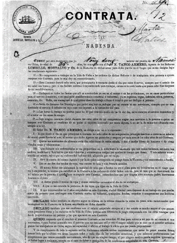 Entre los aspectos complementarios a los sistemas de representación deben contemplarse las condiciones objetivas en la contratación de la servidumbre asiática. Tanco fue agente comercial de la compañía Lombillo y Montalvo, estructurada de manera jerárquica, con personal encargado en labores de enganche, también denominados corredores, sobre quienes recaía la responsabilidad moral de la contratación.61 Tanco, por el contrario, asumió un cómodo rol de agente intermediario. A los enganchadores les correspondía la recolección del número de culíes requerido por la compañía anglocubana, a cambio de una comisión inicialmente de tres pesos por individuo. Más adelante, su remuneración se regularizó a través de agencias bancarias establecidas en Hong Kong.62 El ejercicio de la contratación simboliza el escenario de luchas alrededor de la libertad, porque dos discursos opuestos, dominantes y subordinados, enmarcaron el sistema de su representación. La voz del agente dominante, expresada en contratas y actas notariales de registro, señaló la contratación como un acuerdo laboral legal, favorable para los campesinos desocupados de la China.63 La voz del subordinado, en cambio, consignada en la intervención de la Oficina de Relaciones Internacionales china (Zongli Yamen) en 1874, señala la contratación como producto del engaño, secuestro y violencia física.64