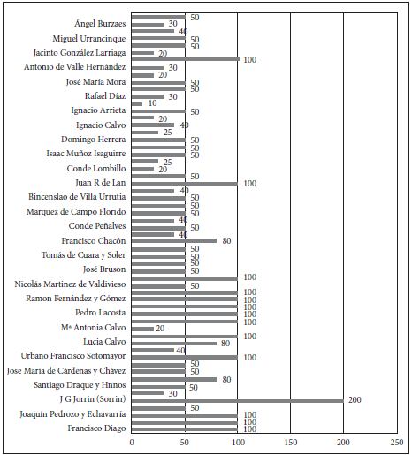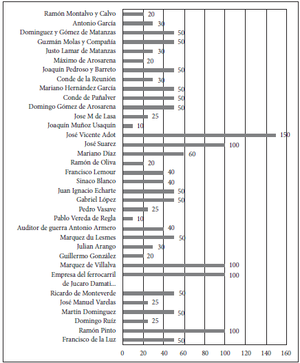 Figura 6: Señores hacendados que se han suscrito a tomar colonos asiáticos a la Real Junta de Fomento por medio de la casa Villoldo, Wardrove & Cía desde el 21 al 26 de enero de 1852.