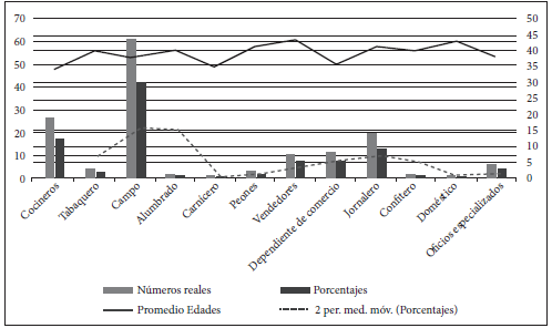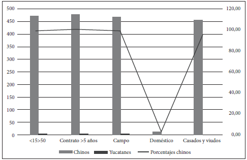 Los precios de los peones asiáticos variaban de acuerdo a la forma de la contratación. Los pagamentos declarados en las consignaciones oscilaron entre 170, 204, 284 y 340 pesos, cifra condicionada a las cantidades de colonos contratados y a la depreciación de su valor en una década.70 El colono firmaba un contrato por ocho años con un salario fijo de cuatro pesos mensuales y sus necesidades básicas quedaban reducidas al número de vestidos necesarios y a las raciones alimenticias requeridas para su subsistencia.71 A su llegada a China, Tanco encontró un sistema de comercialización de culíes perfeccionado. En esa medida, los enganchadores recibían una comisión a contra-entrega fijada en seis pesos por cada colono en buenas condiciones mentales y de salud.72 Los hacendados buscaban colonos robustos, ágiles, laboriosos, destinados a oficios agrarios, aunque es importante subrayar una mayor diversidad en las tareas, oficios y obligaciones de las que ha registrado la historiografía. En las figuras 7 y 8 se muestra una complejidad demográfica hasta ahora desconocida; los colonos asiáticos -aunque ocupados en las faenas agrarias- también desarrollaron destrezas y habilidades manuales, que les permitieron ocupar labores domésticas y técnicas como la carpintería, zapatería, ventas y otros oficios especializados.73 De igual manera, un estudio detallado de los censos poblacionales señala que el grupo correspondiente a los culíes chinos también incluía a hombres casados, viudos y menores de edad, aunque se esperaban hombres con edad suficiente para participar en esta trata y preferiblemente menores de cincuenta años (figura 9).74