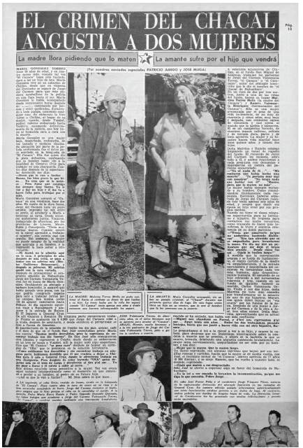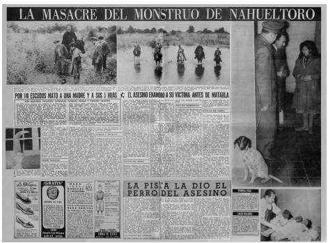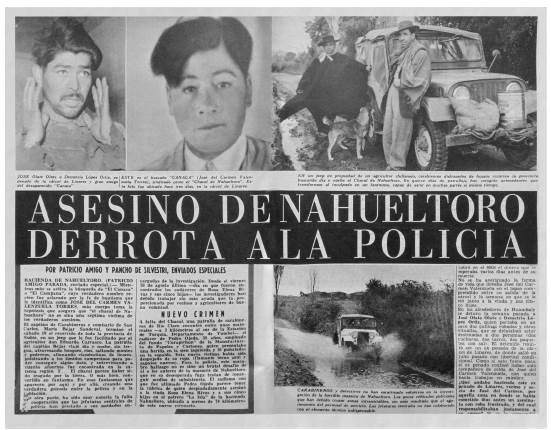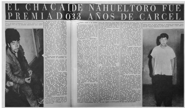 Desde el 1° de septiembre de 1960 aparecieron en Vea diversas informaciones sobre la muerte de una viuda y sus cinco hijas en la localidad de Nahueltoro, a unos 20 km de la ciudad de Chillán, y aproximadamente a 500 km de Santiago, en el sur del país.17 Si bien Vea funcionaba en la capital de Chile, la cobertura en otras regiones era parte de su agenda editorial y respondía a la lógica de una publicación de masas cuyos reportajes tomaban un carácter nacional, a pesar de ocurrir en lugares específicos del territorio. Con frases como "El asesino enamoró a su víctima antes de matarla" o "La pista la dio el perro del asesino", la revista se preocupó de construir una línea dramática centrada, en un comienzo, en entregar detalles del crimen, de las víctimas (en especial de las menores) y en hacer un llamado para capturar a un criminal que hasta ese momento estaba prófugo de la justicia. Con un encabezado central en las páginas interiores, el cual aludía a la "masacre del monstruo de Nahueltoro",18Vea se encargó de entregar una construcción de sentido basada en el esquema del melodrama,19 no solo recogiendo testimonios fuertemente adjetivados por los enviados especiales Patricio Amigo y Pancho Silvestri (que luego sería reemplazado por José Pichanga Muga), sino además destacando la animalidad del victimario. Desde el mencionado número comenzó a usarse una serie de expresiones que aludían a la naturaleza bestial de quien había cometido el crimen: "Una familia entera es masacrada por un chacal".20 En realidad, estas construcciones de perfiles de asesinos realizadas por Vea y otros medios del periodo seguían, en términos generales, un patrón similar, pues se concentraban en destacar y respaldar con imágenes los caracteres irracionales y bestiales que los textos escritos describían.21 Por ello, no era extraño que aparecieran mal vestidos, sucios, con miradas perdidas y gestos desafiantes ante la cámara, lo que complementaba perfectamente lo sostenido en las narraciones que acentuaban detalles escabrosos, los cuales llamaban la atención de los lectores, pues no era simple coincidencia que cuando un crimen brutal se producía y era cubierto de dicha manera, aumentaba la demanda de diarios y revistas, más aún cuando estos medios, como estrategia de venta y expectación, alargaban la historia durante semanas o meses dependiendo del número de familiares, la historia de vida del victimario y las opiniones de autoridades sobre el particular.