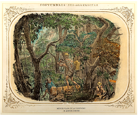 - Torres Méndez, Ramón. Modo de viajar en las montañas de Quindío i Sonsón. 1851. Litografía iluminada. Colección de arte del Banco de la República, Bogotá. 🠔