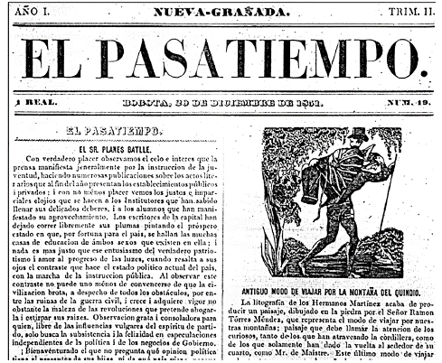 En El Pasatiempo podemos encontrar la aplicación de las estrategias mencionadas. Con una circulación semanal, este periódico tuvo unas condiciones de suscripción, costos y distribución específicas, y alcanzó una significativa recepción en el territorio nacional al contar con agencias en importantes ciudades como Barranquilla, Cali, Medellín, Neiva, Ocaña, Panamá, Sogamoso, Tunja, Vélez, entre otras.77 Además, se destacó por el uso de imágenes como estrategia publicitaria para su difusión.78 En octubre de 1851, por ejemplo, se anunció la publicación de "una serie de láminas iluminadas que representan los trajes, modos de viajar, escenas populares y paisajes tomados de la naturaleza", y se afirmó que las imágenes eran "ejecutadas con fidelidad y maestría" por "el crayon i pincel del artista nacional Ramon Torres Méndez". Además, se promocionaron las suscripciones "en la misma litografía a 12 reales el trimestre, para los suscritores que pagando por trimestres adelantados, se suscriban a toda la serie".79