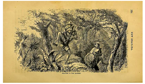 El gesto que lleva a cabo Caicedo de describir, a modo de écfrasis, la lámina hecha por Torres no es de poca monta. Un acumulado de descripciones y de imágenes del carguero, que, como lo veremos más adelante, han circulado en diferentes circuitos internacionales, llevó a que este personaje se convirtiera en una imagen. Se ha configurado, de este modo, lo que Horst Bredekamp denomina "acto icónico sustitutivo", esto es, el efecto performativo de la imagen que configura la sustitución del cuerpo por parte de la imagen, o de la imagen por parte del cuerpo.37 En el caso del texto de Caicedo es la imagen de Torres, y no el viaje, la que se ha hecho objeto de la descripción. Se confía de este modo en que la lámina, que el cuadro de costumbres está describiendo, sustituya el viaje para aquellos que no pueden experimentarlo en cuerpo propio. De hecho, unos años más tarde, Isaac Holton38 usará la lámina de Torres (junto con otras doce) como modelo para uno de los grabados en madera de su propio libro publicado en Nueva York (figura 3). Holton se presentará allí como "testigo directo"39 de los hechos que se representan en la imagen. De esta manera, la lámina cumple su objetivo de sustituir el viaje mismo.