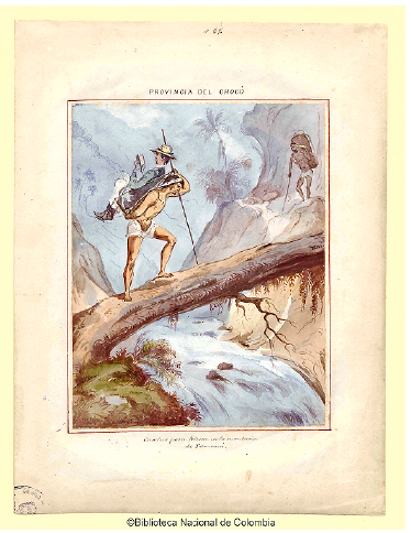 - Anónimo. Camino a Nóvita en la montaña de Tamaná. 1853. Acuarela sobre papel. Biblioteca Nacional de Colombia, Bogotá. 🠔