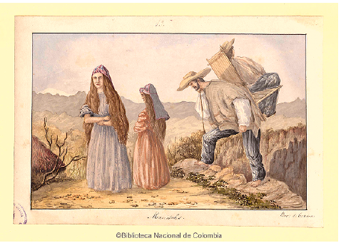 - Torres Méndez, Ramón. Peón carguero de las tierras altas. 1850. Litografía iluminada. Colección de arte del Banco de la República, Bogotá. 🠔