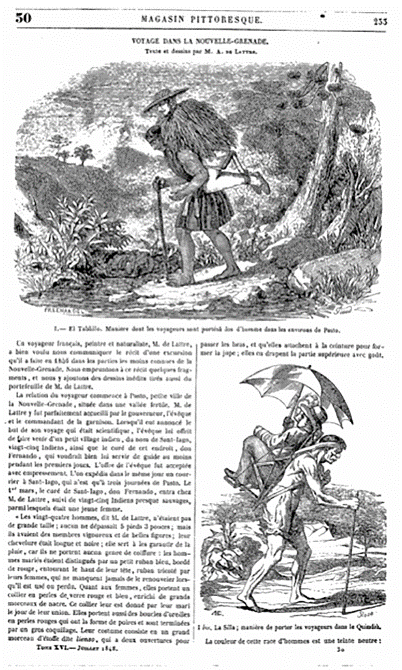 En 1851 y en 1853 José Caicedo Rojas1 y Santiago Pérez2 publicaron sendos textos en los que se pueden encontrar metáforas que surgen de la comparación entre los cargueros de hombres y los animales de carga. A su vez, estos textos estaban relacionados con un par de imágenes -una de Ramón Torres Méndez, y otra de un pintor anónimo de la Comisión Corográfica- que configuraban visualmente gestos, poses, acciones y pasiones de hombres que cargaban a otros hombres por medio del uso de sillas acondicionadas en la espalda. Las metáforas y las imágenes no fueron, sin embargo, acuñadas por ninguno de estos personajes. Ya en 1802, en su segundo paso por la Nueva Granada, Humboldt había anotado en su diario, mientras atravesaba el paso del Quindío, que en ese lugar "se dice montar sobre gente, como sobre caballos; andar en carguero, como andar en bestia".3 Esta afirmación será repetida en su obra Vues des cordillères.4 Este texto, prolíficamente ilustrado, tuvo una amplísima circulación tanto en Europa como en América, y se convirtió en un paradigma de los relatos de viaje del siglo XIX.5 De la misma manera, la descripción del paso por la montaña del Quindío, y el encuentro con los cargueros, se mostró en una imagen: la quinta lámina reproducida en Vues.