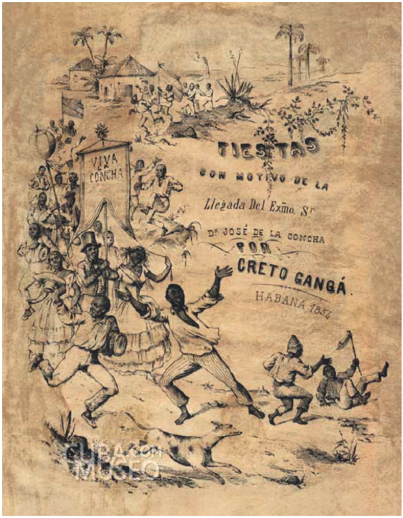 Vale la pena detenernos en este personaje ficticio que representaba a los negros esclavos, concebido por Bartolomé José Crespo, escritor gallego, autor de varios libros costumbristas que justamente se distinguían por hacer uso de la forma de hablar de la población negra de Cuba. ¿Por qué seleccionar a este personaje para darle la bienvenida al nuevo capitán general? El tono burlesco del personaje al apropiarse del lenguaje de los amos de manera deformada, marcaba la franca intención del autor de ridiculizar. Por otro lado, las doce ilustraciones de Landaluze, ubicadas al reverso de cada hoja, mostraban una población negra alegre, despreocupada, podría decirse que hasta complacida de vivir en su condición de subordinación. La portada, a su vez, representa una especie de procesión o desfile de población negra. Algunos, en primer plano, van ataviados como esclavos, a quienes les siguen otros con ropas de fiesta portando un estandarte con el texto "Viva Concha". A lo lejos, bohíos y palmeras refuerzan la contextualización de la isla (figura 1). La euforia, divertimento, y alegría de los hombres y mujeres negras que se plasman reunidos en esta portada, se aderezan con un par de niños que parecieran jugar, mientras uno de ellos cae en el terreno portando una banderilla. Detrás de toda esta imagen resulta evidente la intención de mostrar homogéneamente a los negros como divertidos, alegres, torpes, deseosos de comportarse y de vestirse a la altura, subordinados al régimen político, paradójicamente felices de su condición de esclavitud.
