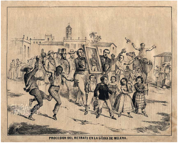 En otra de las láminas del folleto, titulada "Procesión del retrato en la Güira de Melena" (figura 2), la población que porta el retrato del homenajeado es blanca. Niños, señores y damas van bien ataviados, con la torre de la iglesia al fondo, cual signo de jerarquía y legitimación de ese grupo social y racial. A los lados, los campesinos, desde sus bohíos apenas silueteados, y una pareja de negros, representados con exageración en el tratamiento de sus proporciones de cuerpos y cabeza, bailan divertidos, con igual intención burlesca, en contraposición a la discreción y respetabilidad del otro grupo de hombres y mujeres blancos que protagonizan el acto.