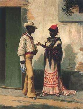 Figuran dos esclavos de casa grande que se acicalan y componen á la dernier: ella con escogido traje de ricas telas y aún con joyas y preseas de sus amitas que se las prestaron galantemente para tal objeto, él con fino pantalón de satén, frac negro de última moda, corbata blanca sobre limpia camisa de batista, guantes de cabritilla, etc.39