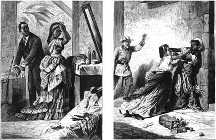 Las obras landaluzianas también contaron con un público receptor en España, donde eran conocidas mediante publicaciones como La Ilustración Española y Americana, la cual, en su número de 1874, comentó dos grabados que eran "copia, según fotografía, de dos cuadros debidos al pincel del distinguido artista de La Habana Don Patricio de Landaluce".38 Se trataba de dos escenas protagonizadas por mulatas cubanas: "La Toilette para el sarao" y "Una pelea de mujeres de color" (figura 6).