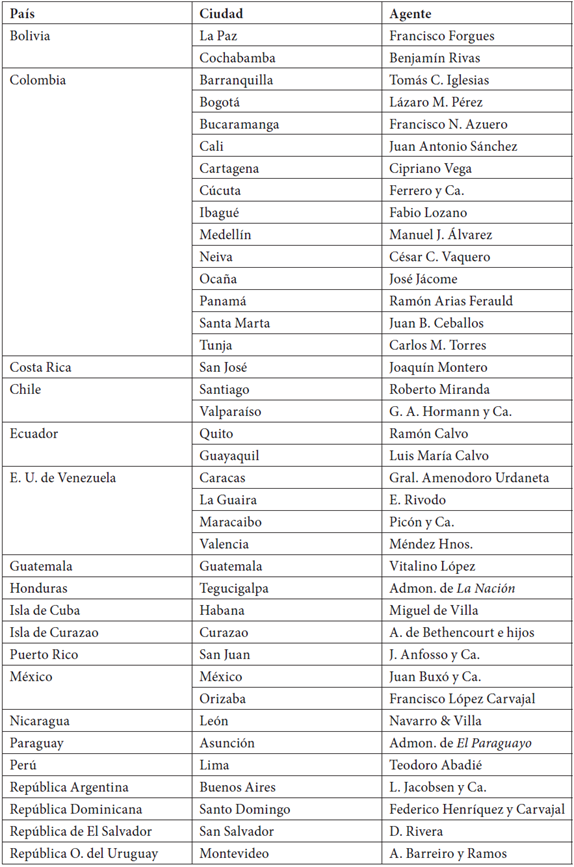 Un largo listado de los agentes autorizados para recibir suscripciones cerraba este material de propaganda. Reafirmando el carácter internacional de Poetas Hispano-Americanos, la red tejida por Pérez para darle visibilidad y desarrollo a la colección fue desplegada por completo, mostrando una división entre los países latinoamericanos y el resto del mundo. La tabla 1 da cuenta del primero de estos grupos, y evidencia la variedad de firmas implicadas entre librerías y casas comerciales. No obstante, en los países privilegiados con un mayor número de tomos, los encargados de dar difusión y funcionamiento al proyecto serían siempre libreros reputados y cercanos a los círculos letrados y eruditos, como el danés Louis Jacobsen en Buenos Aires, Roberto Miranda en Santiago, Miguel de Villa en La Habana y Agustín de Bethencourt en Curazao. En México y Montevideo la tarea sería asumida por los españoles Juan Boixó y Antonio Barreiro y Ramos, respectivamente, dos libreros igualmente acreditados. La segunda y más global agrupación privilegió, por su parte, a figuras claves del comercio europeo del libro en español, como Édouard Dufossé, Fernando Fé y los Bastinos, localizados en París, Madrid y Barcelona, respectivamente (tabla 2).