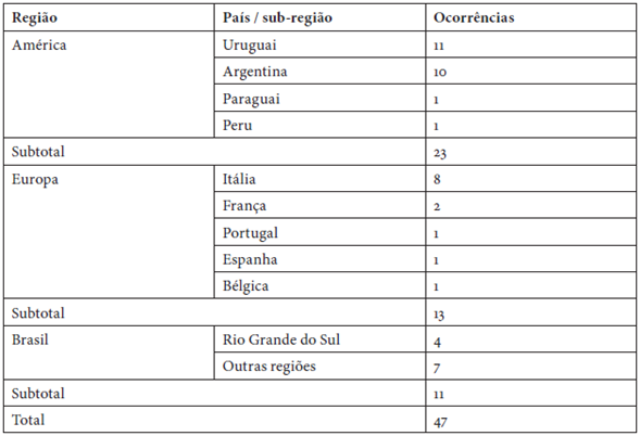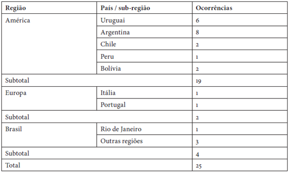 Os dois lugares escolhidos para a análise, Rio de Janeiro e Rio Grande do Sul, justificam-se em função de que o primeiro, circunscrito à cidade do Rio de Janeiro, era a capital política e cultural do país naquele momento. O segundo lugar, que abrange o estado do Rio Grande do Sul, embora majoritariamente as referências sejam da capital do estado, Porto Alegre, consta na pesquisa por sua histórica conexão com os países platinos, o que pode incorrer em algum padrão diferenciado de circulação de notícias.