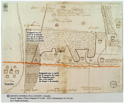 Los indígenas de Soacha también se quejaron en 1646 porque el presidente de la Real Audiencia, Luis de Borja, los despojó de sus tierras de resguardo en 1606, dejándoles solo la tierra alrededor del pueblo (figura 5), por lo cual muchas familias tuvieron que emigrar, dejando el pueblo sin suficientes habitantes para pagar sus tributos.43