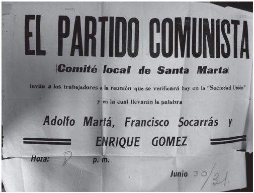 Las relaciones entre los comunistas y el mundo tipográfico fueron frágiles y tuvieron que pasar por un proceso de reacomodamiento. En este nuevo contexto, en el que las redes locales desaparecieron parcialmente, es difícil establecer si las relaciones de los comunistas con los impresores a quienes tuvieron que recurrir para publicar sus hojas, carteles o periódicos obedecían a criterios exclusivamente comerciales o si, por el contrario, existía un vínculo político. Para el caso de Bogotá o la región de Ciénaga, donde se publicaron numerosas hojas volantes en los primeros dos años de la década de 1930, parece existir una relación en la que primaban los criterios comerciales. Así, en los seguimientos e informes policiales que se hicieron a los líderes comunistas de la región de Ciénaga no aparece Eduardo Solá, propietario de la Tipografía Poliarquía, como simpatizante o dentro de las redes del comunismo en Magdalena.30 En estos pequeños poblados, donde los talleres tipográficos no eran numerosos, las decisiones sobre el contenido de los impresos parecen estar mediadas por intereses comerciales que responden a las demandas del mercado local, aunque no se puede descartar una atmósfera de simpatía hacia la organización comunista. En los municipios de Ciénaga, Guacamayal, Aracataca, Sevilla, Tucuringa, en la región del Magdalena, la actividad comunista era constante, como revelan los informes policiales sobre la circulación de hojas volantes, carteles impresos, periódicos comunistas locales y extranjeros y la organización de conferencias comunistas (figura 1).