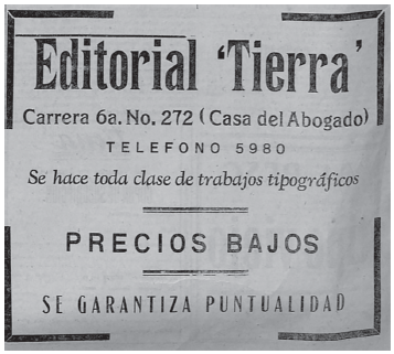 Estos elementos del periódico Tierra que hemos definido como los rasgos del funcionamiento de las empresas tipográficas o talleres de impresión de periódicos resultan limitados sin la existencia de una empresa editorial. Al formalizar el periódico ante el Juez de Prensa, la editorial encargada era J. E. Posse, pero a pocas semanas del lanzamiento del periódico y como producto de algunas campañas de sostenimiento exitosas, el partido tomó "la totalidad de la editorial" en la que se imprimía el diario. Esto permitió, por un lado, que se superaran algunos problemas técnicos relacionados con la composición tipográfica y con los tiempos de salida del periódico, tal y como lo describen los editores: "numerosos errores tipográficos, así como la presentación y la rápida salida de 'Tierra' serán, por tanto, deficiencias que estamos en condiciones de corregir en los sucesivo".41 Por otro lado, se dispuso una nueva organización de los tiempos para la publicación del periódico y algunos miembros del partido comunista pasaron a ocuparse de las tareas tipográficas para su publicación. Estos aspectos permitieron que el partido se convirtiera en un agente tipográfico en la ciudad de Bogotá. La Editorial Tierra apareció así en septiembre de 1932 como una más de las pequeñas empresas tipográficas existentes en la ciudad.42 Con este pequeño taller, el partido pudo considerar la ampliación de la oferta de trabajos tipográficos y aliviar la falta de recursos para mantener a flote el periódico por la tardanza en los envíos del pago por la suscripción desde las regiones (figura 3).