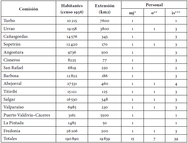 Las comisiones sanitarias estaban encabezadas por un médico jefe y un grupo de inspectores sanitarios. Funcionaban como instituciones de higiene pública, tratamiento de enfermedades transmisibles, educación y propaganda, saneamiento del suelo y protección infantil.61 Además, tenían un carácter móvil. Su objetivo era realizar labores determinadas en una población y luego desplazarse a otra zona. Lo ideal era que, con el paso del tiempo y si las condiciones fiscales lo permitían, las comisiones se asentaran y se convirtieran en "pequeñas unidades sanitarias" de carácter permanente. Estas unidades fijas se introdujeron gradualmente en el país. La primera de ellas, que empezó a funcionar en el departamento de Antioquia, se estableció en el municipio de Sonsón en 1939. Debido a problemas presupuestales para ese año, Antioquia era el único departamento donde faltaba crear unidades sanitarias.62 El tamaño de la población a atender y la extensión del territorio hacen evidente la magnitud de la tarea que enfrentaba el personal de ciertas comisiones en esta región (tabla 2).