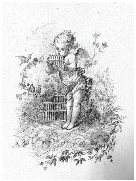 Del álbum de Lastenia quisiera destacar, por último, la presencia de un dibujo de la pintora Rosa Ponce de Portocarrero (figura 6), a quien el escritor José Asunción Silva dedicó una carta abierta en defensa del arte que fue publicada en 1892 con el título "Elogio del arte" en la revista Gris de Bogotá y reproducida por la revista Azul de México en 1894.31 En esta carta, el escritor recuerda un encuentro con la pintora en 1888 en su chalet de Funza, momento en el que discutieron ideas acerca del arte mientras que detrás de ellos oían las voces de los demás visitantes hombres que debatían "sus graves cuestiones económicas". Silva concibe allí el arte como opuesto a la lógica del capital económico e industrial y halla complicidad en esta artista mujer. El dibujo a lápiz que Rosa Ponce le dedica a Lastenia en su álbum representa a un ángel tocando una zampoña (un instrumento local, andino). Al parecer, está llamando a los pájaros que, encantados, serán atrapados en la jaula que se encuentra a sus pies. De alguna manera, la imagen de la artista parece replicar el elogio del arte de Silva, sugiriendo que es la música del instrumento la que logra cautivar a los pájaros, en lugar de que la música de la naturaleza cautive al oído humano -o celestial, en este caso-.