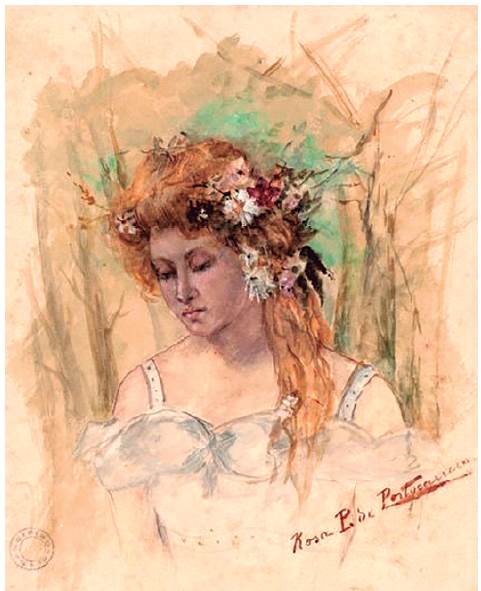 La presencia de Rosa Ponce en este álbum es significativa, ya que a finales del siglo XIX la educación artística de las señoras y señoritas se reducía -como en el caso analizado de la educación musical- al aprendizaje de actividades domésticas y artes decorativas con clases de bordado, música y pintura de flores y bodegones, que son motivo frecuente en los álbumes femeninos y que, desde lo doméstico y manual, también forman un lenguaje y un tipo de conocimiento que debe ser incorporado al estudio de la vida de las mujeres.32 La dificultad para acceder a la enseñanza del arte oficial impidió que las mujeres de finales del siglo XIX y comienzos del XX contaran con el reconocimiento y la legitimidad que tenían los hombres, al no considerarse su labor como un ejercicio profesional. Por ello, su producción artística fue casi invisible para la historia del arte colombiano.33 Es posible entonces que el álbum funcionara para las mujeres como una esfera abierta y más democrática para incursionar en la pintura o el dibujo y poder desplegar su trabajo a la par de los hombres. Las redes de amistad con otras mujeres hicieron posible tener un espacio para su arte en las páginas de sus álbumes y ser reconocidas, en esos lazos afectivos, también por su valor artístico. De hecho, poco se sabe de Rosa Ponce de Portocarrero más allá de algunas menciones en la prensa del siglo XIX que dan cuenta de su participación en exposiciones y eventos cívicos, así como su producción artística constante, destacándose el hecho de que fue la primera profesora mujer de la sección de pintura de la Escuela de Bellas Artes entre 1907 y 1911. El Museo del Banco de la República conserva en su colección permanente un retrato hecho por Ponce de Portocarrero en 1905. Retrato de una señora (figura 7) plasma una imagen, que parece inconclusa, de una mujer melancólica en la cual se destacan los detalles de las flores que adornan el cabello y la transparencia del vestido. En la descripción del museo se pone énfasis en la firma de la artista, que indica que estaba casada. Esto resulta curioso porque, al igual que con la música, algunos críticos de la época consideraban que al ser la pintura solo un pasatiempo, este pasaría a un segundo plano cuando la mujer contrajera matrimonio.34 Sin embargo, Rosa Ponce de Portocarrero probablemente pensó su arte y a sí misma en relación con el arte en un plano profesional.
