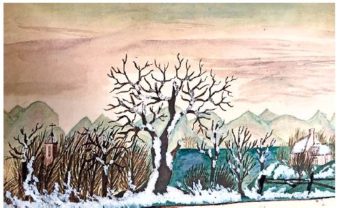 En un estilo similar, se incluye un dibujo (que se puede deducir, entonces, que es propio) sin inscripciones que imita la estética paisajística del anterior y que retrata una escena de invierno (figura 11). El dibujo va seguido de un poema titulado El invierno, firmado por Mariano Manrique. Si bien no es un recorte, esta pintura sugiere una interpretación personal del poema de Manrique que acentúa el carácter combinado del álbum entre escritura y visualidad.