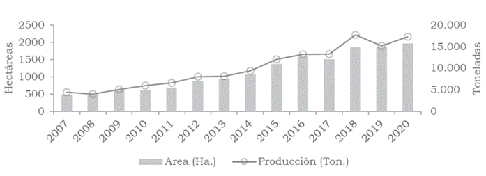 Figura 1: Área sembrada y producción nacional de pitahaya (2007-2021). Fuente: elaboraciónpropiacon base en Agronet (2022).