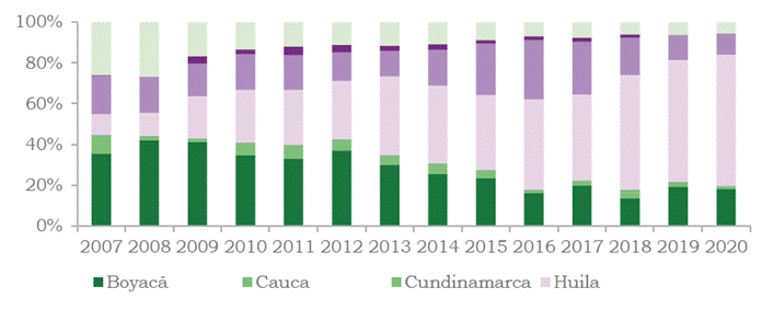 A nivel nacional, los departamentos de Huila, Boyacá, Santander y el Valle del Cauca, en su orden, representan el 97.4 % del total de la producción y el 94.6 % del área sembrada. Por su parte el municipio de Miraflores (Boyacá) representó para 2020 el 75.5 % del total de producción departamental. En la serie es evidente el crecimiento de la participación del Huila al pasar de representar el 10.2 % en 2007 al 65.6 % del total de la producción nacional en 2021 (Agronet, 2022; Figura 2). El precio promedio del kilogramo de fruta (de todas las calidades) en Corabastos fue de $6106 en 2017, $6372 en 2018, $6040 en 2019, $5862 en 2020 y $9583 en 2021 pr (cifras en pesos colombianos) (Figura 3).