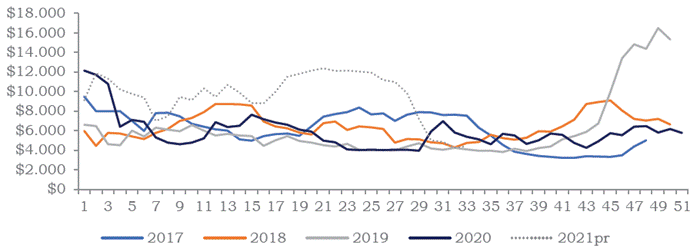 Figura 3.Precio: semanal medio de la pitahaya en Corabastos (Bogotá) (2017-2021 pr). Fuente: elaboraciónpropia con base en el SIPSA del DANE (2021).