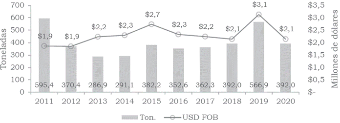 En el período 2011-2020 se exportaron 39917 toneladas de pitahaya. Los principales destinos fueron Brasil (25 %), Hong-Kong (21 %), Francia (10 %), Países Bajos (9 %), Canadá (7 %), España (5 %), Emiratos Árabes Unidos (5 %), Singapur (3 %) y Alemania (3 %). Para ese mismo periodo, el promedio de exportaciones fue de 399 toneladas y 2.3 millones de dólares FOB anuales (Figura 4). Un informe reciente del gobierno alemán señala que la oferta de Israel y Vietnam suele ser más barata dado el desplazamiento marítimo mientras que la proveniente de Colombia y Ecuador resulta más costosa al ser transportada por vía aérea (Import Promotion Desk, 2020).