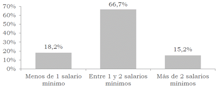Por otro lado, sus perspectivas de ingresos son mínimas pues al preguntarles Al mes, ¿cuál cree que sea usted el ingreso mínimo necesario para vivir de la agricultura? cerca del 66.7 % de los encuestados manifestó que un salario entre $908 526 y $1 817 052 sería suficiente (Figura 5), a pesar de que la mayor parte de las familias se clasificaría como nuclear con hijos (73 %) (incluyendo hogares biparentales, monoparentales) y ampliada (21 %) (se comparte el hogar con familiares como padres, madres, hermanos, nietos, primos o sobrinos) y el tamaño promedio del hogar es de 3.5 personas. Apenas el 39.4 % de los encuestados tiene otra fuente de ingresos en actividades diversas que incluyen ganadería, comercio minorista y transporte.