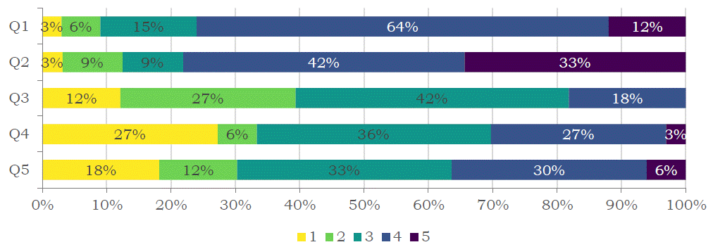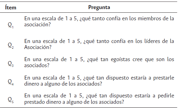 El instrumento contiene 5 afirmaciones en una escala de Likert de 5 puntos desde Totalmente en desacuerdo (1) hasta Totalmente de acuerdo (5). Q1 y Q2 son medidas de confianza al interior del grupo y hacía los líderes, respectivamente. Confiar implica superar la aversión al riesgo cediendo el control de bienes propios a otros. Q3 captura egoísmo (la procura del bienestar individual por encima del colectivo). Q4 y Q5 se acercan a la medición de la reciprocidad, que es el intercambio basado en la compensación y contraprestación (no obligatoria, equilibrada ni inmediata) a obsequios, ayudas o favores. Lo anterior también podría relacionarse con la solidaridad (Durston, 2003).