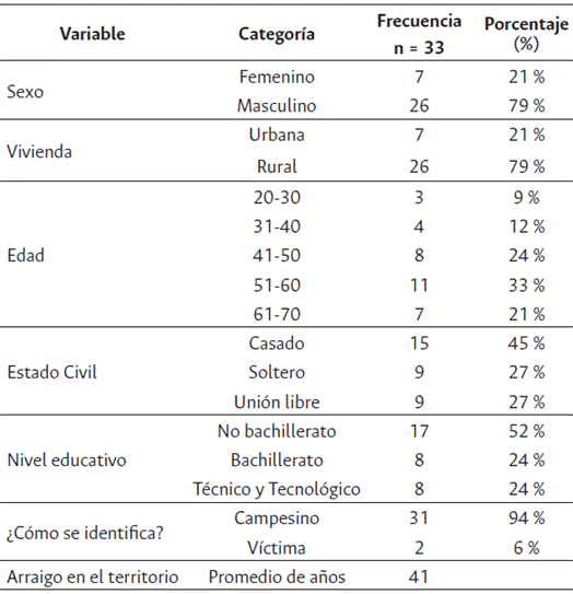 Esta sección resume las principales estadísticas descriptivas. Los datos fueron recolectados en campo y procesados con herramientas ofimáticas. Como puede apreciarse en la Tabla 1, la mayoría de los encuestados son hombres (79 %), autoidentificados campesinos con domicilio en el área rural y niveles educativos diferenciados (la mitad no terminó el bachillerato, mientras que los restantes son bachilleres o cuentan con un nivel adicional de educación). La edad promedio de los encuestados es de 50 años. La vereda donde más se concentran es Rusa (39 %) seguida de Pueblo y Cajón (15 %) y Miraflores (15 %).