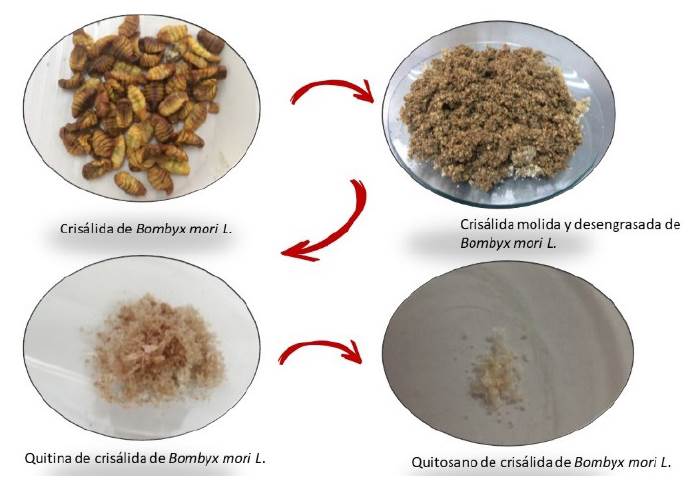En la región conocida como el triángulo del café colombiano (Risaralda, Quindío y Caldas), la sericultura se introdujo para ser una fuente alternativa de recursos. Actualmente, la Universidad Tecnológica de Pereira (UTP), está a cargo del banco de germoplasma de Bombyx mori y de la producción periódica del Híbrido Pílamo 1, obtenido por mejoramiento genético, el cual se cría todo el año (Cifuentes, 1999). En esta universidad se han adelantado estudios para el aprovechamiento integral de subproductos de la sericultura (Gloria et al., 2010a, 2010b), continuando con este propósito, para este trabajo se realizó la extracción de quitina a partir de la crisálida del Híbrido Pílamo 1. Posteriormente se realizó el proceso de desacetilacion de esta para la obtención de quitosano y la caracterización de los biomateriales obtenidos.