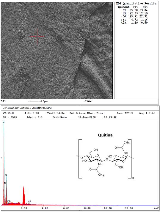 El análisis químico elemental de los biomateriales obtenidos se realizó mediante puntos de interés, a través de perfiles o mapas. En la Figura 8 se observa la ampliación microscópica para el análisis molecular elemental de la quitina obtenida a partir de la crisálida de gusano de seda, donde se encuentra en mayor abundancia el átomo de carbono 55.68 %, seguido de nitrógeno 12.39 % y oxigeno 25.91 %, lo cual coincide con la estructura química de la molécula de quitina. En menor proporción se encuentran los elementos de hierro y cloro que pueden deberse a residuales en el proceso de digestión de la crisálida.