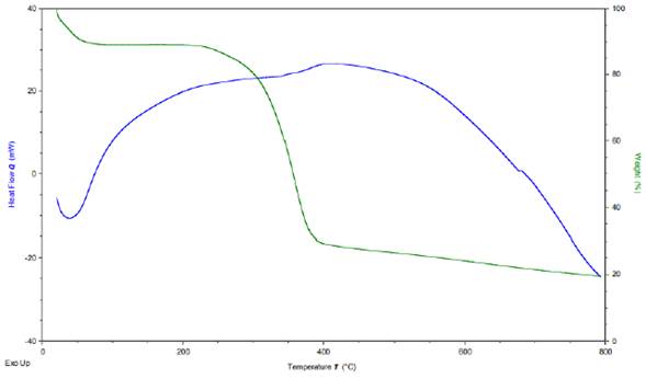 La curva de DSC obtenida para quitina de crisálida de Bombyx mori L. presenta una pérdida de calor entre 50-100° C que puede ser atribuida a la pérdida de agua. También se observa una ganancia de calor entre 100-250° C de 20 mW, la cual permanece medianamente fluctuante hasta 400° C, donde de nuevo se presenta una ganancia de calor entre 30-40 mW, logrando aproximadamente los 500° C. Esto se puede atribuir a un reacomodamiento estructural, finalmente a partir de los 550° C hasta los 800° C se observa la pérdida de energía hasta los -20 mW.